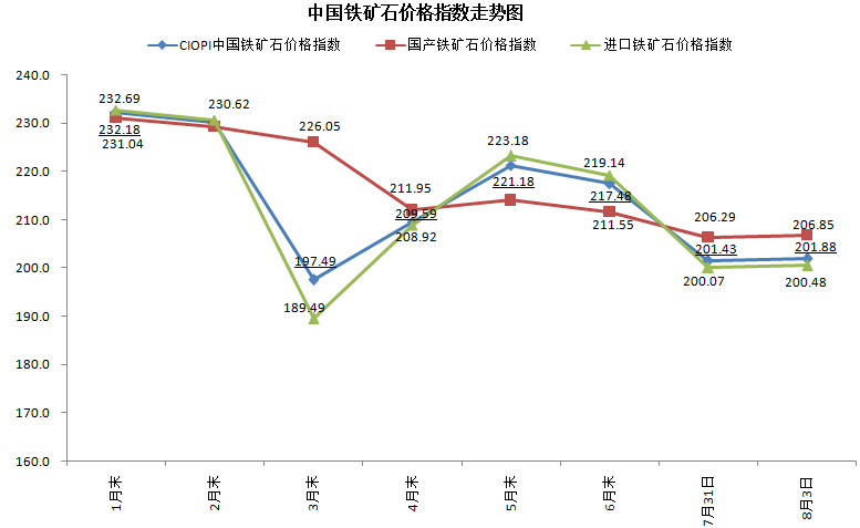 8月3日,中国铁矿石价格指数(CIOPI)201.88点,环比上升0.44点,升幅为0.22%。其中:国产铁矿石价格指数为206.85点,环比上升0.56点,升幅为0.27%;进口铁矿石价格指数为200.48点,环比上升0.41点,升幅为0.20%。