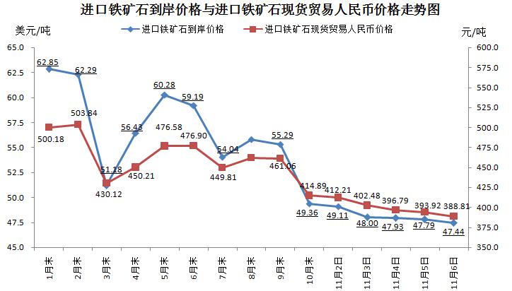 11月6日,直接进口铁矿石62%品位干基粉矿到岸价格为47.44美元/吨(即0.77元/吨度),环比每吨下降0.35美元,降幅为0.73%;当月平均价格为48.05美元/吨。