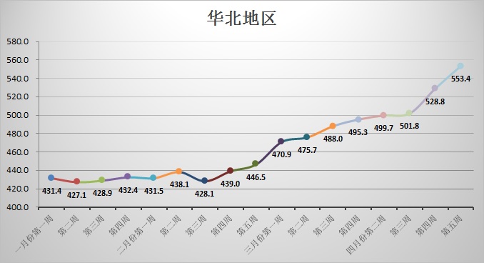 该地区本周价格最高的是辽宁鞍山,为546.0元/吨,最低的是辽宁丹东,为461.8元/吨;环比上周涨幅最大的辽宁抚顺,涨6.3%,涨幅最小的辽宁丹东,涨-2.4%。