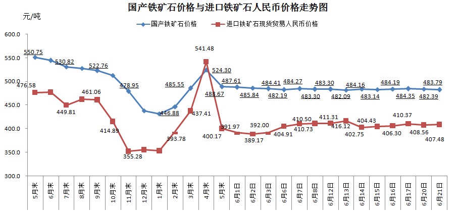 6月21日,国产铁矿石62%品位干基铁精矿含税价格为482.39元/吨,环比每吨下降1.40元,降幅为0.29%,比进口铁矿石高73.83元/吨,升高幅度为18.07%;当月平均价格为483.93元/吨,比进口铁矿石高79.17元/吨,升高幅度为19.56%。