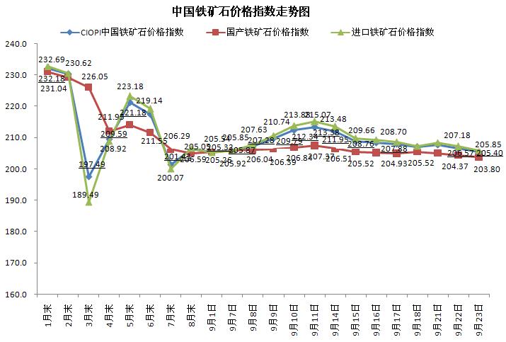 9月23日,中国铁矿石价格指数(CIOPI)205.40点,环比下降1.17点,降幅为0.56%。其中:国产铁矿石价格指数为203.80点,环比下降0.57点,降幅为0.28%;进口铁矿石价格指数为205.85点,环比下降1.33点,降幅为0.64%。