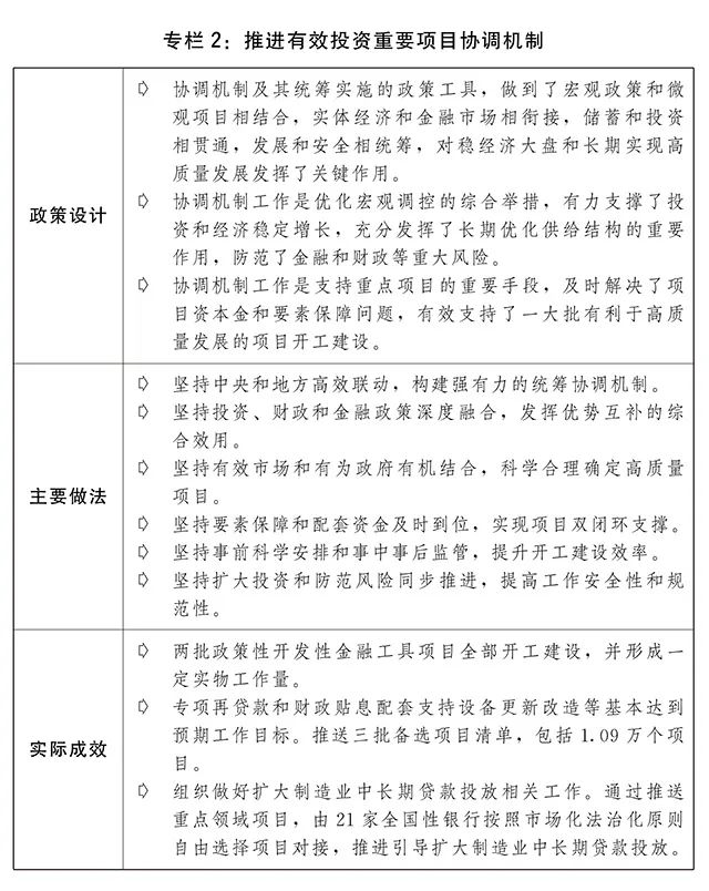 一是投资关键作用充分发挥。建立并高效运转推进有效投资重要项目协调机制,强化用地、环评、用能等要素保障和重大问题协调,做到“资金、要素跟着项目走”,加快推进重点任务落实和重大项目建设,努力形成更多实物工作量。创新设立政策性开发性金融工具,分两批投放基金7400亿元,为重大项目建设补充资本金,支持的2700多个重大项目已全部开工。通过专项再贷款与财政贴息配套支持重点领域设备更新改造,推动扩大制造业中长期贷款投放。适度超前开展基础设施投资,推进“十四五”规划102项重大工程实施,新型基础设施加快布局,川藏铁路全面建设取得良好开局,装机规模全球第二大的白鹤滩水电站全面投产,白鹤滩至江苏、浙江特高压直流输电工程运行,小洋山北侧集装箱码头(陆域部分)、平陆运河工程、南水北调中线引江补汉工程等开工建设。发挥中央预算内投资撬动作用。加快地方政府专项债券发行使用并进一步扩大支持范围。鼓励引导社会资本盘活老项目、投入新项目,促进存量资产和新增投资良性循环,已累计发行上市基础设施领域不动产投资信托基金(REITs)试点项目24个,总发行规模超过780亿元。全面推进城镇老旧小区改造,全国实际新开工老旧小区改造5.25万个。城市基础设施建设短板加快补齐,城市燃气管道等老化更新改造积极推进。全国固定资产投资(不含农户)57.21万亿元,增长5.1%;其中,基础设施、制造业投资分别增长9.4%、9.1%,一定程度弥补了消费收缩缺口。