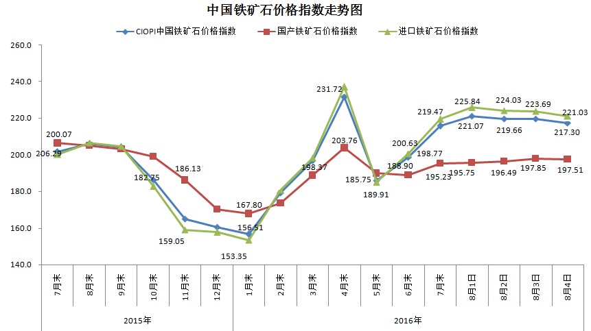 8月4日,中国铁矿石价格指数(CIOPI)217.30点,环比下降2.30点,降幅为1.05%。其中:国产铁矿石价格指数为197.51点,环比下降0.34点,降幅为0. 17%;进口铁矿石价格指数为221.03点,环比下降2.67点,降幅为1.19%。