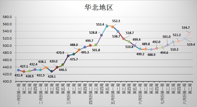 该地区本周价格最高的是辽宁鞍山,为501.8元/吨,最低的是吉林通化,为444.0元/吨;环比上周涨幅最大的辽宁北票,涨3.8%,涨幅最小的辽宁丹东,涨-1.9%。