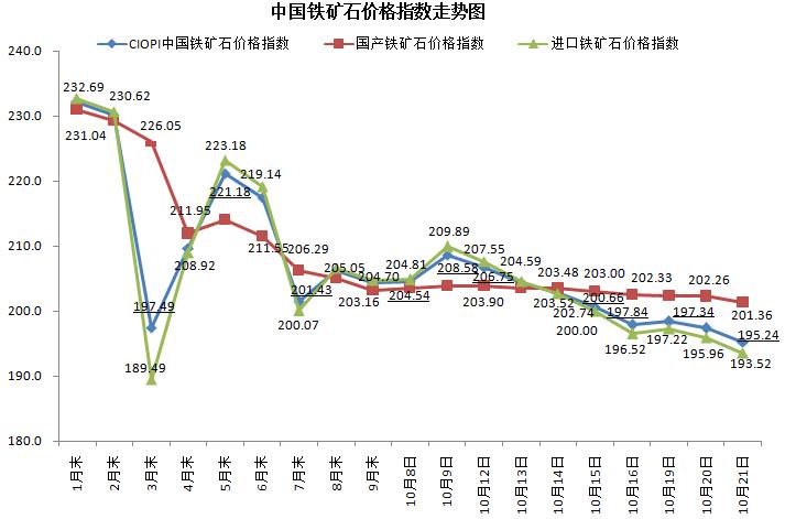 10月21日,中国铁矿石价格指数(CIOPI)195.24点,环比下降2.11点,降幅为1.07%。其中:国产铁矿石价格指数为201.36点,环比下降0.90点,降幅为0.44%;进口铁矿石价格指数为193.52点,环比下降2.44点,降幅为1.25%。