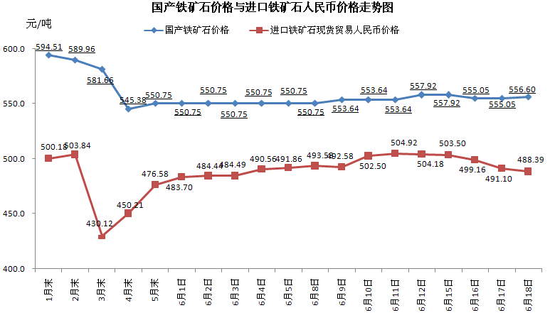 6月18日,国产铁矿石62%品位干基铁精矿含税价格为556.60元/吨,环比每吨上升1.55元,升幅为0.28%,比进口铁矿石高68.21元/吨,升高幅度为13.97%;当月平均价格为553.43元/吨,比进口铁矿石高59.50元/吨,升高幅度为12.05%。