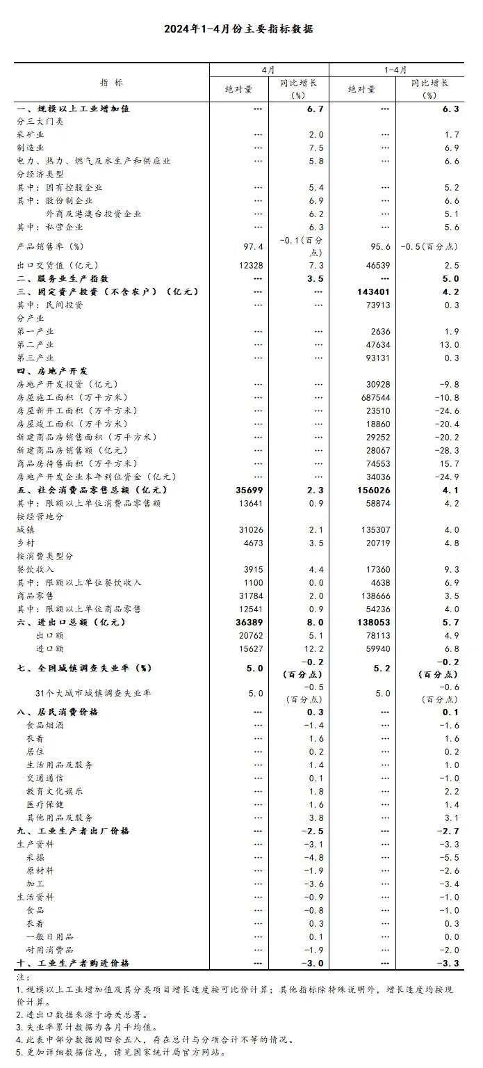 总的来看,4月份国民经济运行平稳,虽然部分指标受节假日错月、上年同期基数较高等因素影响增速有所放缓,但工业、出口、就业、物价等主要指标总体改善,新动能保持较快成长,国民经济延续回升向好态势,积极因素累积增多。但也要看到,外部环境复杂性、严峻性、不确定性明显上升,经济持续回升向好仍面临诸多困难挑战。下阶段,要坚持以习近平新时代中国特色社会主义思想为指导,全面贯彻落实中央政治局会议精神,坚持稳中求进工作总基调,完整、准确、全面贯彻新发展理念,加快构建新发展格局,着力推动高质量发展,靠前发力有效落实已经确定的宏观政策,巩固和增强经济回升向好态势,持续推动经济实现质的有效提升和量的合理增长。