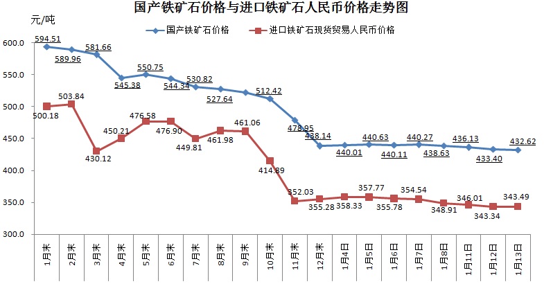 1月13日,国产铁矿石62%品位干基铁精矿含税价格为432.62元/吨,环比每吨下下降0.78元,降幅为0.18%,比进口铁矿石高89.13元/吨,升高幅度为25.95%;当月平均价格为437.73元/吨,比进口铁矿石高86.71元/吨,升高幅度为24.70%。