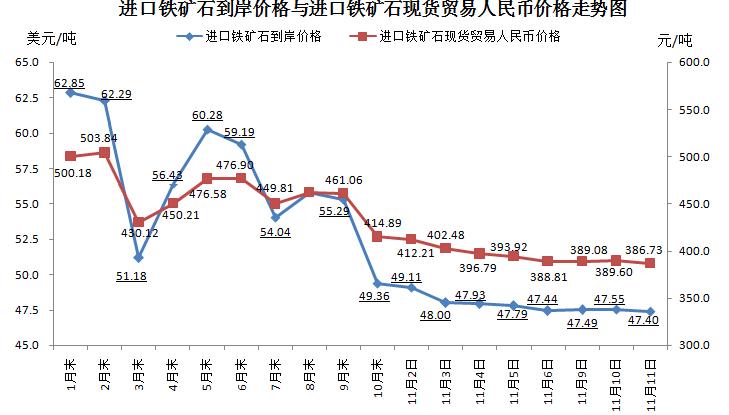 11月11日,直接进口铁矿石62%品位干基粉矿到岸价格为47.40美元/吨(即0.76元/吨度),环比每吨下降0.15美元,降幅为0.32%;当月平均价格为47.84美元/吨。