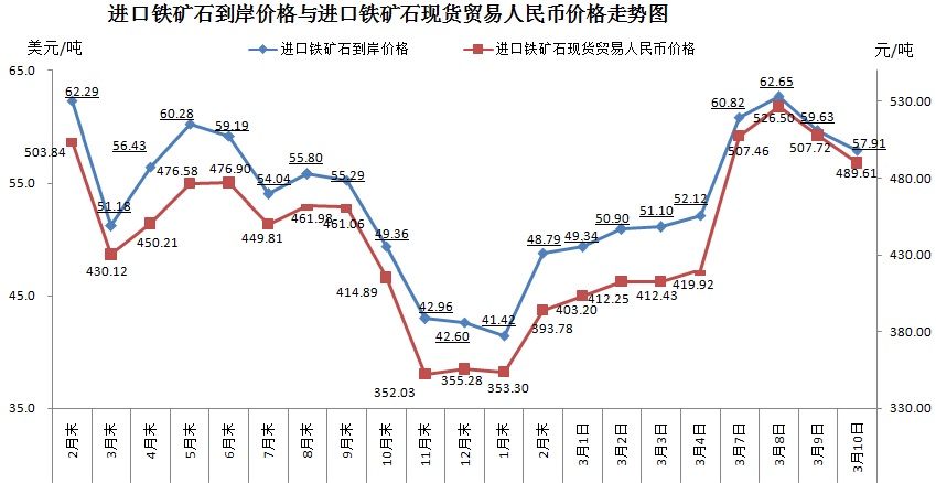 3月10日,直接进口铁矿石62%品位干基粉矿到岸价格为57.91美元/吨(即0.9340元/吨度),环比每吨下降1.72美元,降幅为2.88%;当月平均价格为55.56美元/吨。