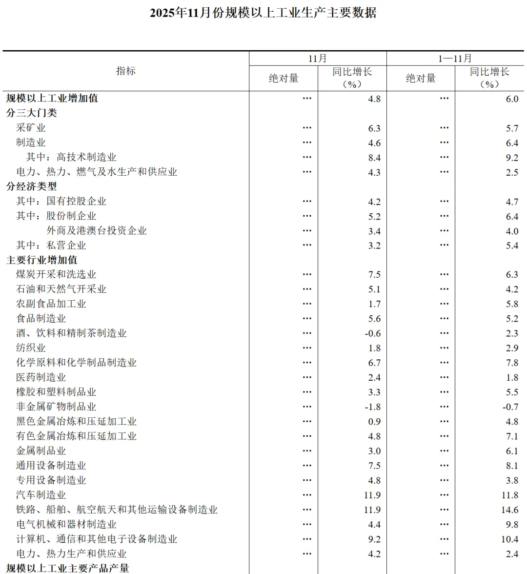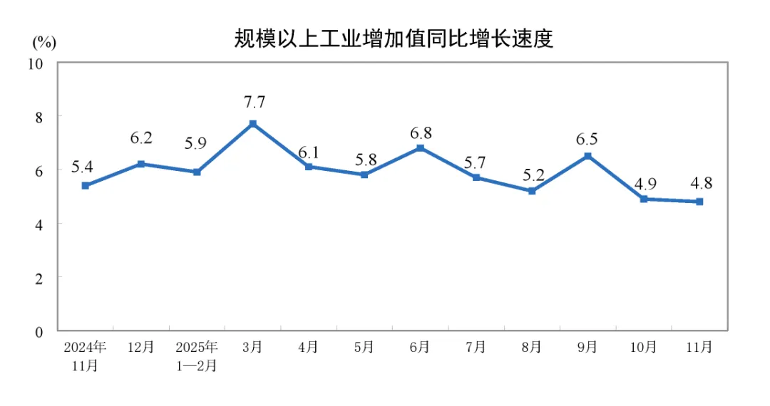 11月份,规模以上工业增加值同比实际增长4.8%(增加值增速均为扣除价格因素的实际增长率)。从环比看,11月份,规模以上工业增加值比上月增长0.44%。1—11月份,规模以上工业增加值同比增长6.0%。