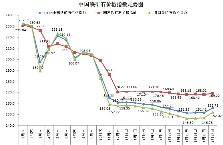 1月18日,中国铁矿石价格指数(CIOPI)155.78点,环比上升4.37点,升幅为2.89%。其中:国产铁矿石价格指数为169.22点,环比上升1.20点,升幅为0.71%;进口铁矿石价格指数为152.02点,环比上升5.26点,升幅为3.58%。