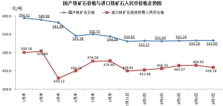 8月7日,国产铁矿石62%品位干基铁精矿含税价格为533.00元/吨,环比每吨下降0.26元,降幅为0.05%,比进口铁矿石高73.82元/吨,升高幅度为16.08%;当月平均价格为532.44元/吨,比进口铁矿石高72.98元/吨,升高幅度为15.88%。