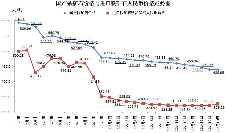 12月18日,国产铁矿石62%品位干基铁精矿含税价格为439.95元/吨,环比每吨上升0.39元,升幅为0.09%,比进口铁矿石高113.66元/吨,升高幅度为34.83%;当月平均价格为461.28元/吨,比进口铁矿石高133.84元/吨,升高幅度为40.87%。