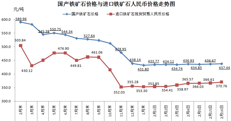 2月16日,国产铁矿石62%品位干基铁精矿含税价格为434.44元/吨,环比每吨上升0.77元,升幅为0.18%,比进口铁矿石高66.68元/吨,升高幅度为17.98%;当月平均价格为435.50元/吨,比进口铁矿石高73.19元/吨,升高幅度为20.20%。